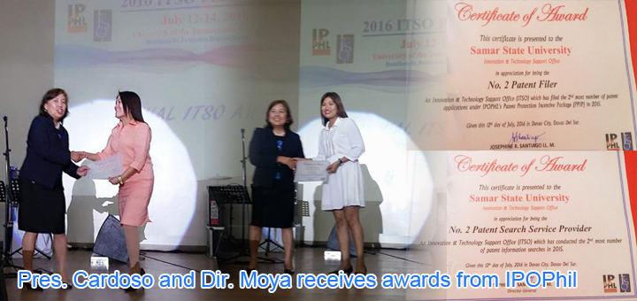 This is the second time in a row that Samar State University received an award from the Intellectual Office of the Philippines (IPOPhil) for patent filing performance. Out of 84 institutions with franchise of IPOPhil’s Innovation and Technology Support Office (ITSO) in the Philippines, SSU was considered 2nd for having the most patent applications.This performance was a 2 steps jump from 4th last year where SSU received the “Anak ni Juan” title, a recognition on the number of its patent application to the IPOPhil. Aside from this award, SSU also received Second Search Service Provider for providing this service to clients who are into patent drafting. To receive the award was Ms. Vivian L. Moya, the Director for Technology Licensing and Innovation Support Office (TLISO) and the university president Dr. Marilyn D. Cardoso.