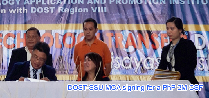 The Department of Science and Technology – Region 8 (DOST 8) and the Samar State University forged a memorandum of agreement to establish a common service facility (CSF) for root crop food processing through the adoption of the Philippine Root Crop Research and Technology Center (PRCRTC) at the Visayas State University (VSU). The said CSF is to serve the super typhoon Yolanda-affected communities in Basey Samar. CSF purpose is to elevate the socio-economic status of farmer beneficiaries by processing harvested crops such as sweet potato and taro into various products using technologies developed by PRCRTC-VSU. Further, the CSF will also be used by faculty and students of Samar State University during weekdays and the farmer beneficiaries on weekends. The project costs a little more than PhP 2M, 83% come from DOST and the rest is the counterpart fund from SSU.