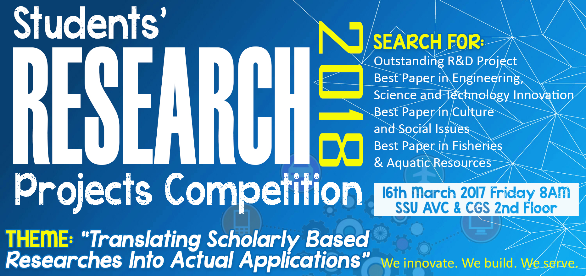 There will be three (3) awards to be given for oral presentation and one (1) for the poster presentation. Paper receiving the highest rating will be awarded as the 2018 outstanding research & development project. The rest of the papers will be ranked according to the rating it received. The next paper with highest rating belonging to the following areas will be considered as best paper. If for example, a social science research was considered as outstanding, no more paper under the same category will be awarded best paper. This means that the outstanding paper on this area is also the best paper. All paper awarded must have a minimum rating of 85%.