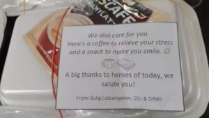 CATBALOGAN CITY – “We also care for you. Here’s coffee to relieve your stress and a snack to make you smile,” Bulig Catbaloganon stated on the note attached to the food packs they have given to the frontliners of Catbalogan City on April 22.
