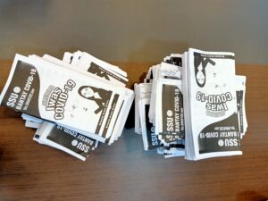 The double-sided leaflets are packed with list of symptoms of the virus, tips on how to decrease vulnerability from COVID-19 infection, ways to protect one’s self and others, steps on making alternative disinfectants, and other important reminders presented in the local dialect Waray.