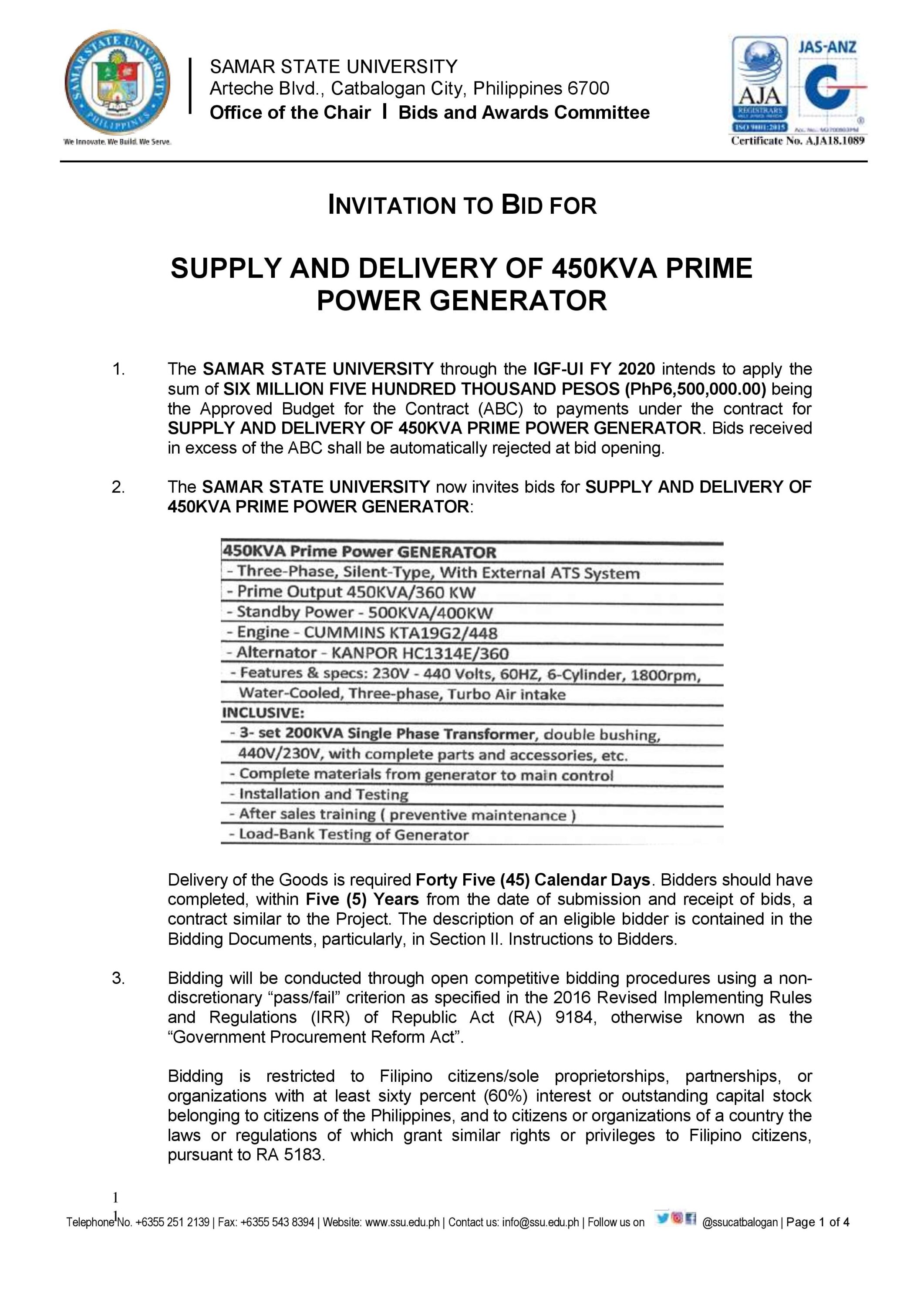 SUPPLY AND DELIVERY OF 450KVA PRIME POWER GENERATOR