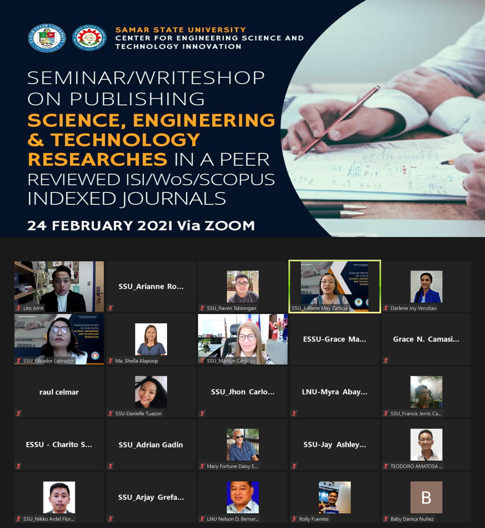 The Seminar/Writeshop on Publishing Science, Engineering, and Technology Researches in a Peer-Reviewed International Scientific Indexing (ISI), Web of Science (WoS), Scopus Indexed Journals was held via online conferencing on February 24 (21). It was attended by 167 participants from SSU, Eastern Samar State University (ESSU), Southern Leyte State University (SLSU), University of Eastern Philippines (UEP), Leyte Normal University (LNU), Western Mindanao State University (WMSU), Department of Education (DepEd), Eastern Visayas State University (EVSU), and Biliran Province State University (BiPSU).