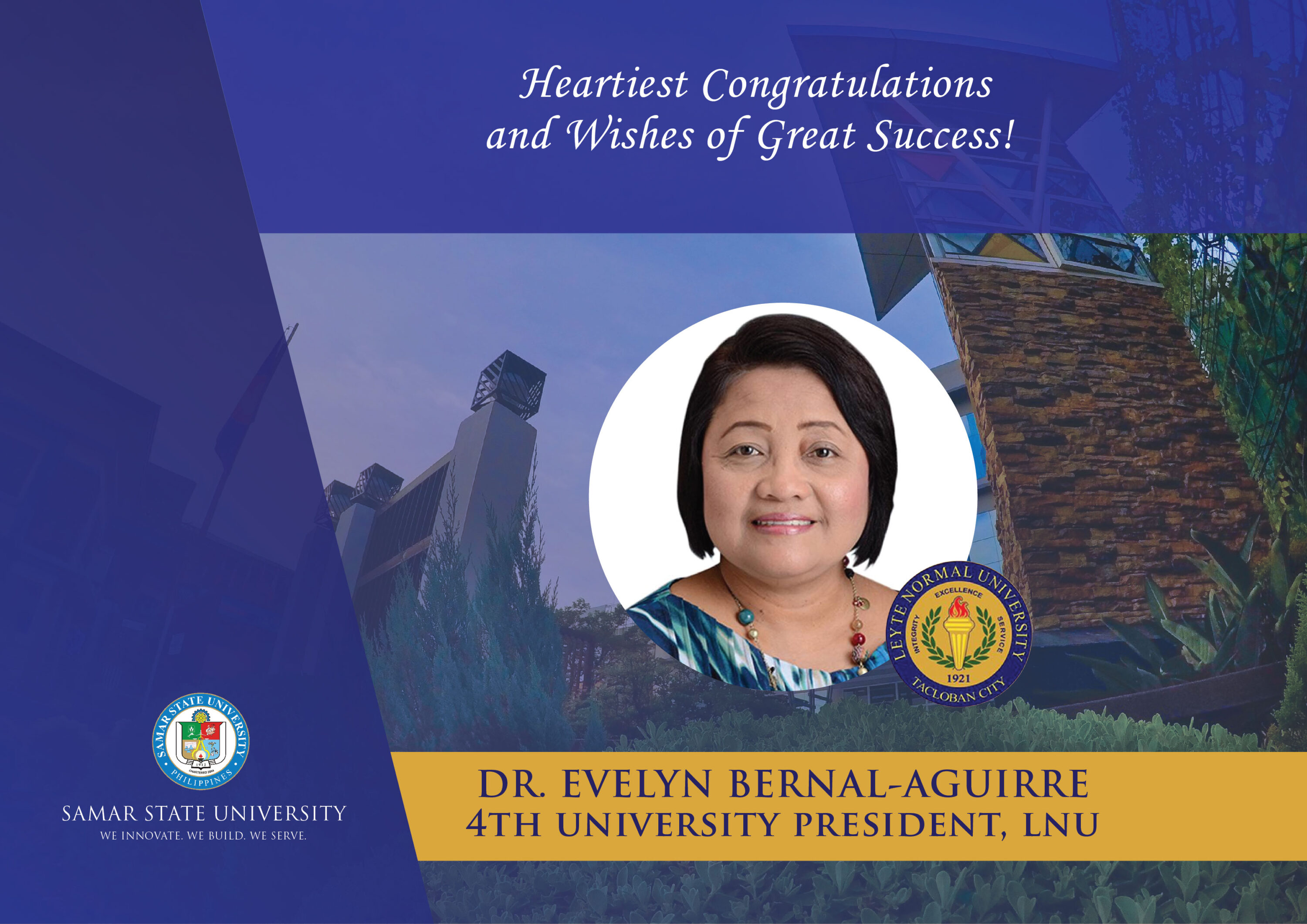 Samar State University (SSU) expresses its heartiest congratulations and wishes of great success to the newly appointed 4th University President of Leyte Normal University, DR. EVELYN BERNAL-AGUIRRE!