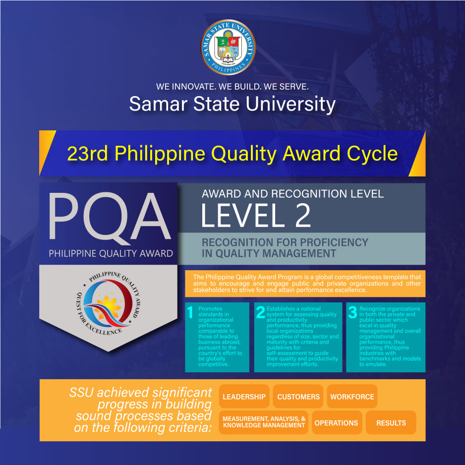 Early this year and on the 23rd PQA Assessment Cycle, SSU submitted for a week-long organizational performance assessment. The University was evaluated along seven (7) criteria: (1) Leadership, (2) Strategy, (3) Customers, (4) Measurement, Analysis, and Knowledge Management, (5) Workforce, (6) Operations, and (7) Results.