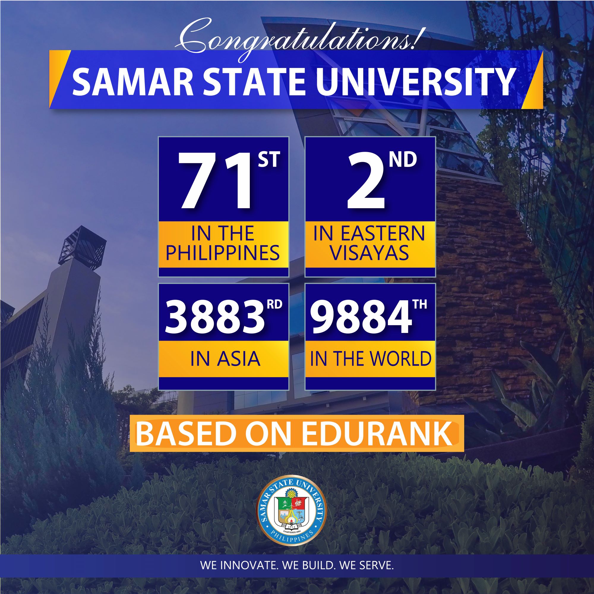 CATBALOGAN CITY─ Samar State University (SSU) joined again the pool of Top Universities in the Philippines as it landed No. 71 in the recent publication of university ranking of EduRank, a web source of social activity in the education sector across countries and continents.