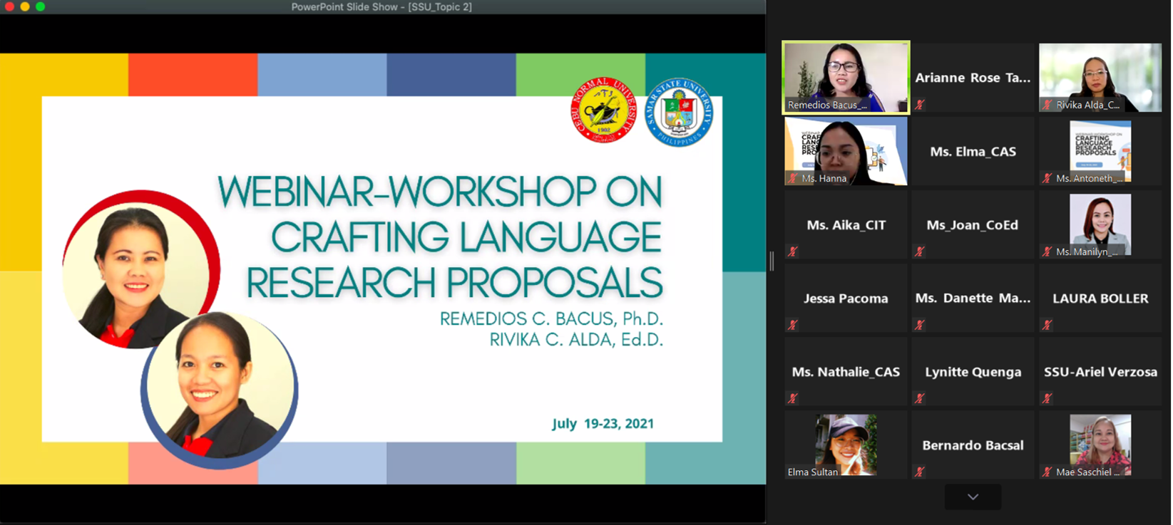CATBALOGAN CITY – Twenty-eight (28) Language Instructors of Samar State University (SSU) participated in Zoom room for the Webinar-Workshop on Crafting Language Research Proposals which commenced on July 19 (21).