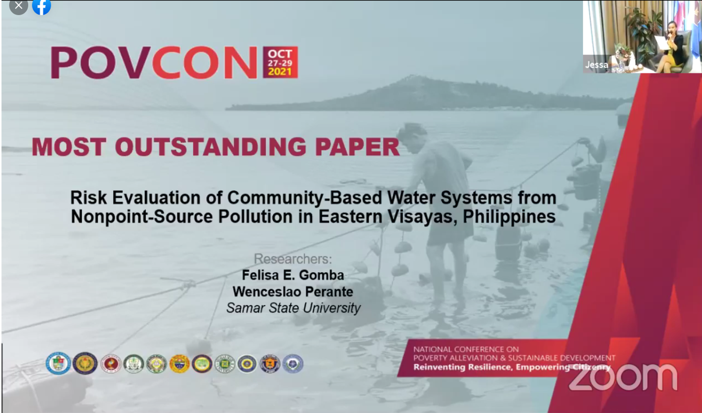 And the Most Outstanding Paper for the 5th POVCON is Dr. Felisa E. Gomba of SSU and Dr. Wenceslao Perante with their paper titled “Risk Evaluation of Community-Based Water Systems from Nonpoint-Source Pollution in Eastern Visayas, Philippines”.