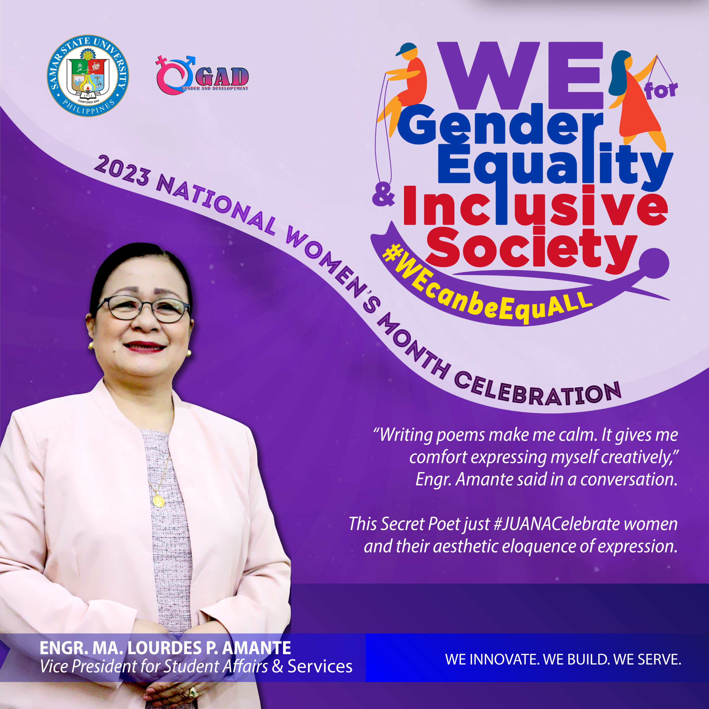 Described as lady-like, religious, and diplomatic, the Vice President for Student Affairs and Services Engr. Ma. Lourdes P. Amante has another distinct characteristic, a talent hidden to all but few. She is a creative artist, and a poet at that.