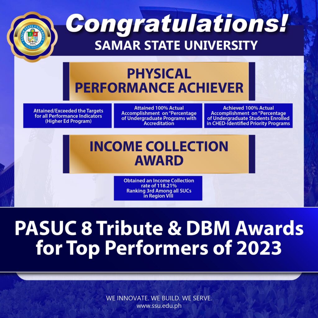 TACLOBAN CITY, Philippines – Samar State University garnered various awards during the “Pagpupugay sa Serbisyong Bayan: PASUC8 Tribute & DBM Awards for Top Performers of 2023,” held on June 27, 2024 at the Summit Hotel, Tacloban City, Philippines.