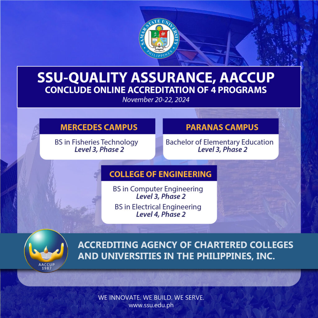 CATBALOGAN CITY, Philippines — Samar State University (SSU) garnered remarkable impressions in a recently concluded three-day accreditation visit by the Accrediting Agency of Chartered Colleges and Universities in the Philippines, Inc. (AACCUP), held from November 20 to 22, 2024, via Zoom. The visit evaluated various academic programs, including BS in Computer Engineering, BS in Electrical Engineering, Bachelor of Elementary Education, and BS in Fisheries Technology.