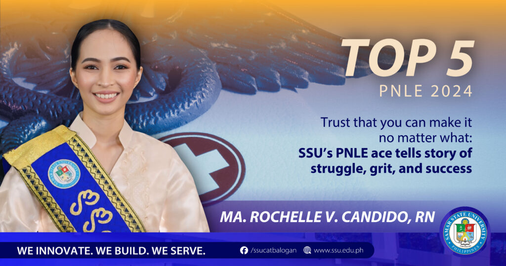 CATBALOGAN CITY, Philippines—The celebration continues for Ma. Rochelle V. Candido, SSU nursing alumna, who brought honor and pride to Samar State University (SSU) by placing fifth during the November 2024 Philippine Nursing Licensure Examination (PNLE). This is the third consecutive time that SSU’s College of Nursing and Health Sciences (CONHS) produced a topnotcher for the nursing boards.