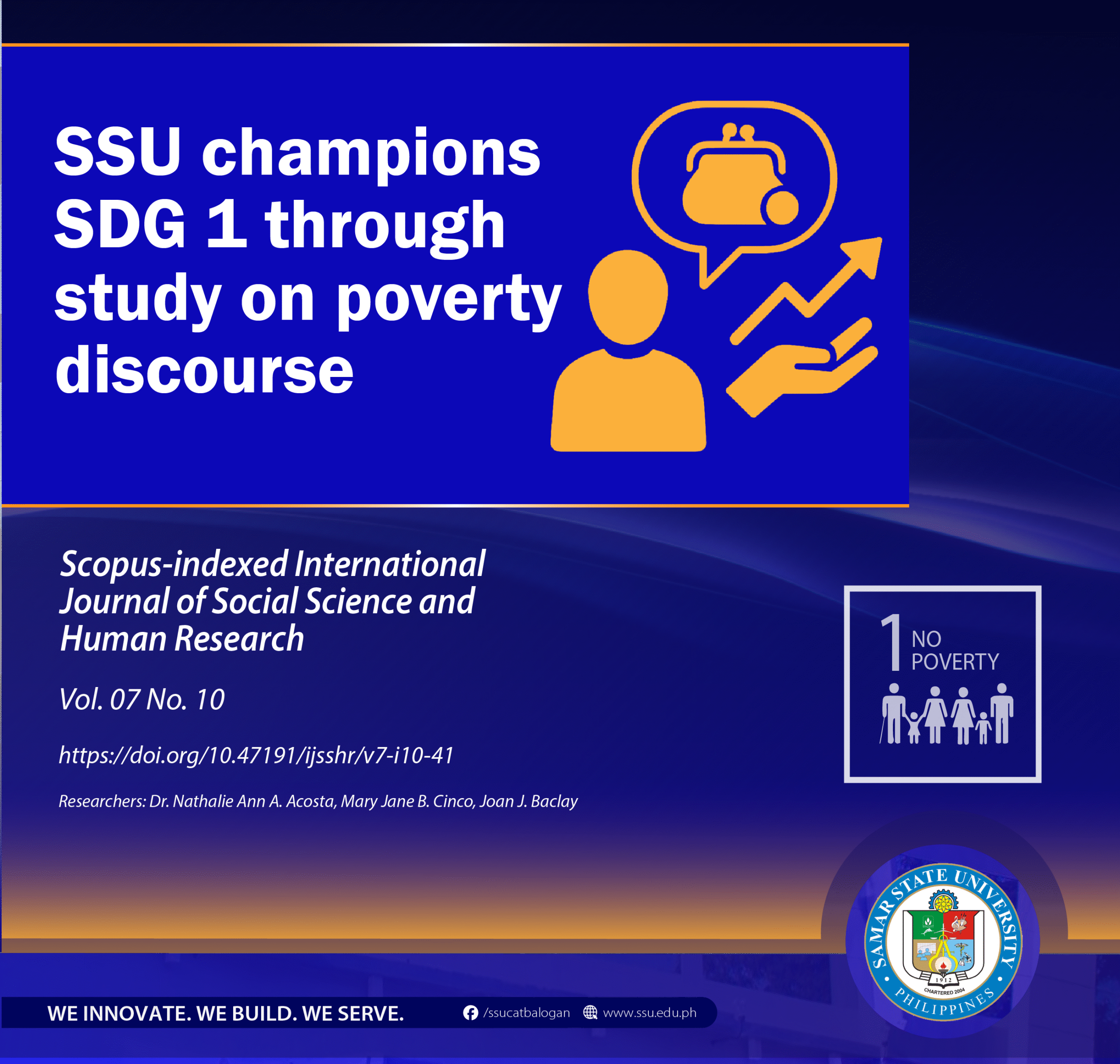 CATBALOGAN CITY, Philippines— In support of the global goal to end poverty in all its forms, Samar State University (SSU) champions the Sustainable Development Goal 1 (No Poverty) through the study, “Discourses of Poverty: The Narratives of the Poor in Samar,” published in the Scopus-indexed International Journal of Social Science and Human Research.