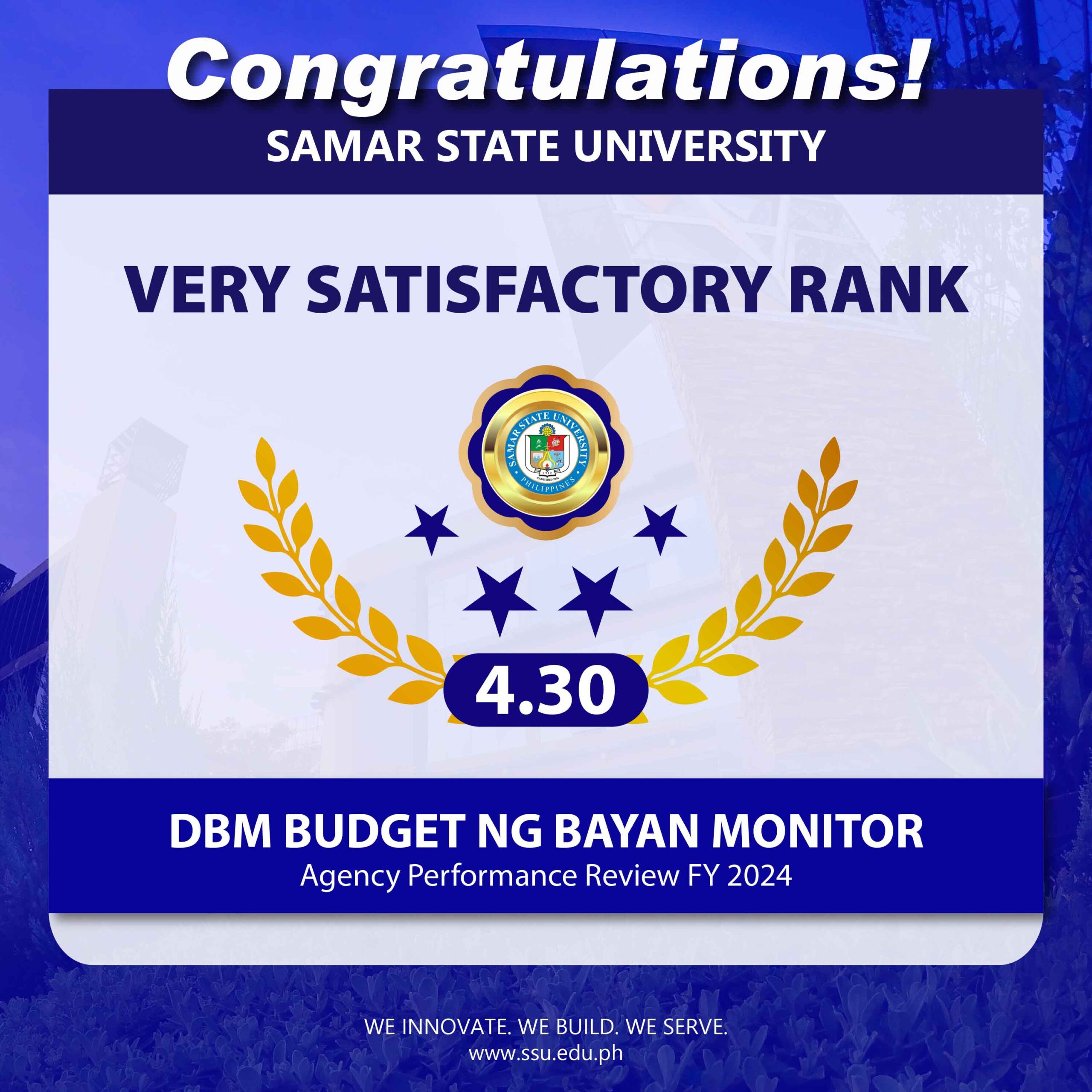 CATBALOGAN CITY, Philippines—Samar State University (SSU) has once again proven its strong fiscal and institutional stewardship after receiving a “Very Satisfactory” rating of 4.30 in the 2024 Annual Performance Review (APR) steered by the Department of Budget and Management (DBM).