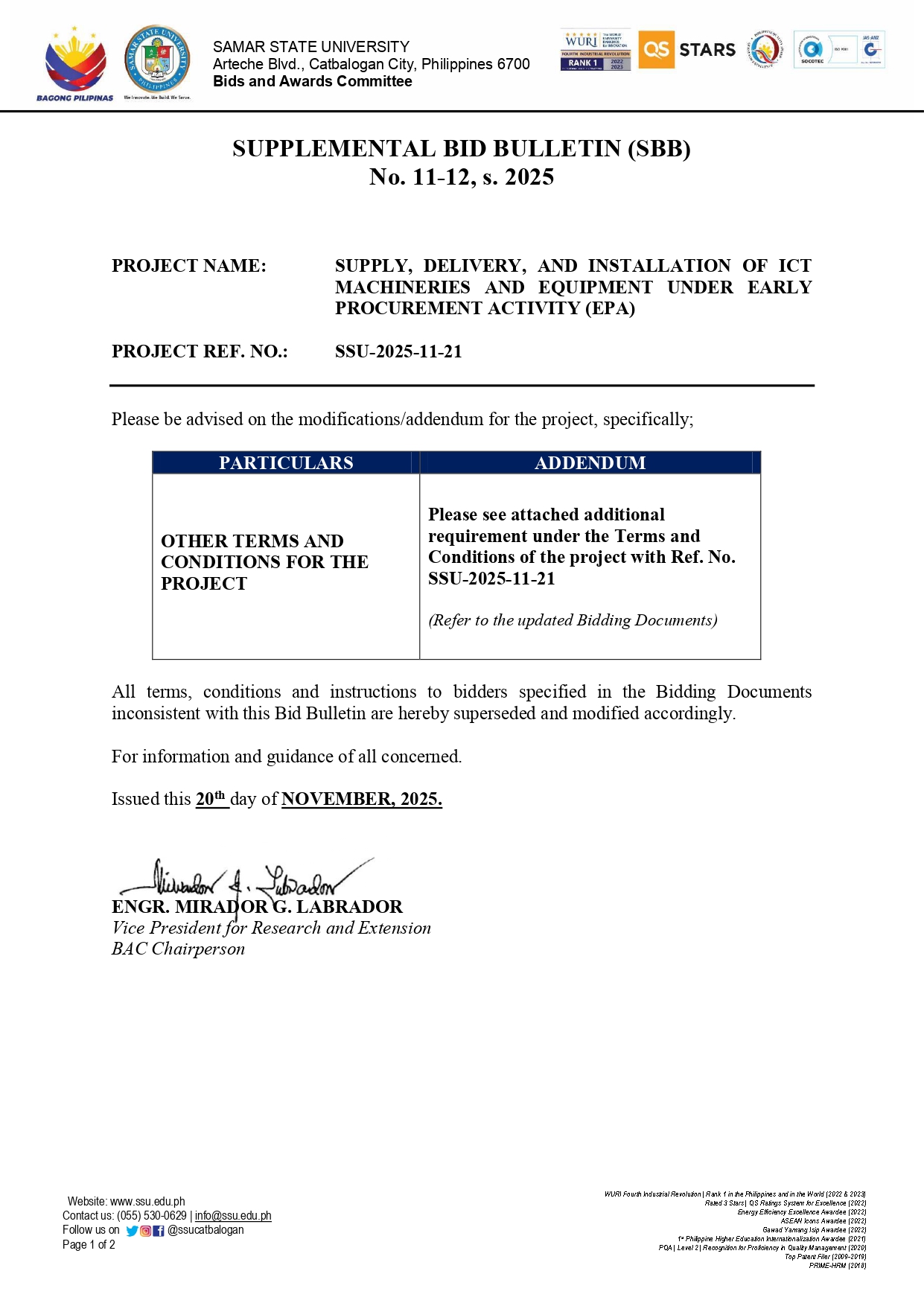 SUPPLEMENTAL BID BULLETIN (SBB) No. 11-12, s.2025: SUPPLY, DELIVERY AND INSTALLATION OF ICT MACHINERIES AND EQUIPMENT UNDER EARLY PROCUREMENT ACTIVITY (Ref. No.: SSU-2025-11-21) Leave a Comment / Bids Notices / Admin SUPPLEMENTAL BID BULLETIN (SBB) No. 11-12, s.2025: SUPPLY, DELIVERY AND INSTALLATION OF ICT MACHINERIES AND EQUIPMENT UNDER EARLY PROCUREMENT ACTIVITY (Ref. No.: SSU-2025-11-21) Read More »