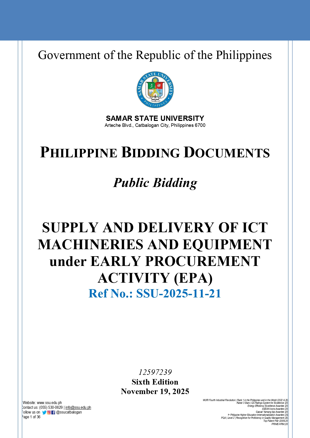 Invitation to Bid for the Supply and Delivery of ICT Machineries and Equipment under Early Procurement Activity (EPA) Ref No.: SSU-2025-11-21 Leave a Comment / Bids Notices / Admin Invitation to Bid for the Supply and Delivery of ICT Machineries and Equipment under Early Procurement Activity (EPA) Ref No.: SSU-2025-11-21 Read More »