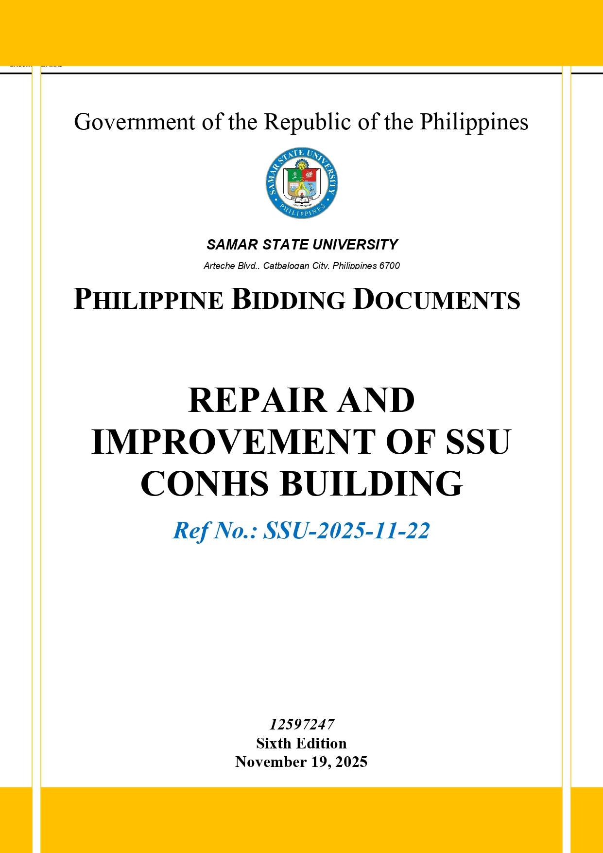 Invitation to Bid for the Repair and Improvement of SSU CONHS Building (Ref No: SSU-2025-11-22) Leave a Comment / Bids Notices / Admin Invitation to Bid for the Repair and Improvement of SSU CONHS Building (Ref No: SSU-2025-11-22) Read More »