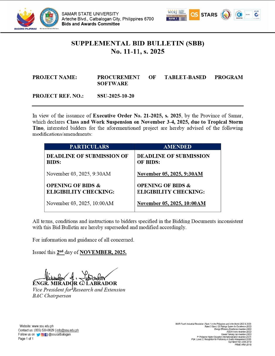 SUPPLEMENTAL BID BULLETIN (SBB) No. 11-11, s.2025: PROCUREMENT OF TABLET-BASED PROGRAM SOFTWARE (Ref. No.: SSU-2025-10-20) Leave a Comment / Bids Notices / Admin SUPPLEMENTAL BID BULLETIN (SBB) No. 11-11, s.2025: PROCUREMENT OF TABLET-BASED PROGRAM SOFTWARE (Ref. No.: SSU-2025-10-20) Read More »