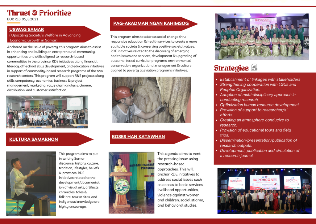 With the development of the times, connection between higher education and social development becomes increasingly closer, and universities and the cities or provinces where they are located play an exceptional role in promoting development of the cities or the province. For this, Samar State University plays an integral role in the development of Samar province, in particular and the country, in general. Thus, it is an important approach to depend on university resources to realize scientific development to enhance provincial competitiveness. The gigantic task of the University to help alleviate the condition of Samareños requires its faculty, staff and students’ engagement in researches and practices that address culture and social issues for solutions to some of the most pressing and immediate concerns of Samar. In 2000, when Samar State Polytechnic College was preparing for its Universityhood, it formulated a roadmap that by year 2011-2015, three Research Centers will be established- one of which is Samar Socio-Cultural Research and Development Center. The said Center was formally approved per BOR Resolution No. 28, series 2012 which was later named as Research Center for Culture & Social Issues by BOR Resolution No. 15, series 2016.