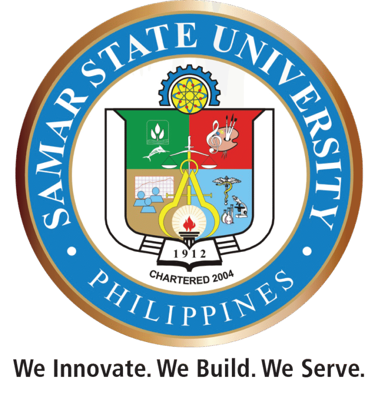 Encircling the whole symbols is the name of the university (Samar State University) and the country (Philippines) in white over sky blue background and outlined in gold, the official colors of the University.